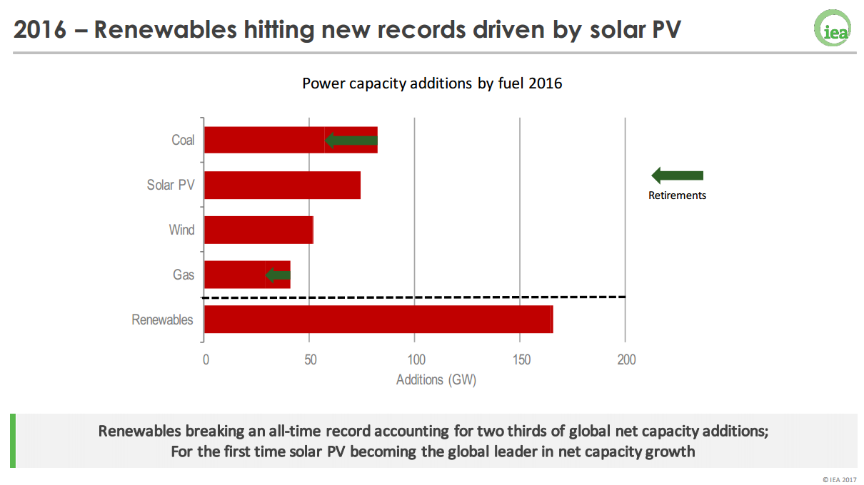 Так, майже дві третини електрогенеруючих потужностей, введених у 2016 р., - це об’єкти, які працюють на «чистих» джерелах енергії. Це близько 165 ГВт. З них 74 ГВт – це сонячна енергетика.