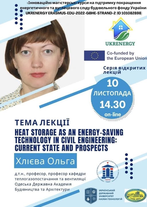 Within the UKRENERGY project Odesa State Academy of Civil Engineering and Architecture invites to take part in online lecture by Khlieva Olga, Doctor of Technical Sciences, Professor, Department of Heat and Gas Supply and Ventilation.