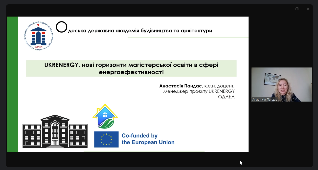 On September 17-18, 2024, the Kyiv Chamber of Commerce and Industry together with the Kyiv City State Administration held a two-day workshop on topical issues of energy saving and use of alternative energy sources for business, which was attended by Anastasia Pandas, PhD in Economics, Associate Professor of the Odesa State Academy of Civil Engineering and Architecture, who made a presentation “UKRENERGY: New Horizons of Master's Education in Energy Efficiency”, confirming the relevance and importance of the project for training a new generation of energy efficiency specialists.