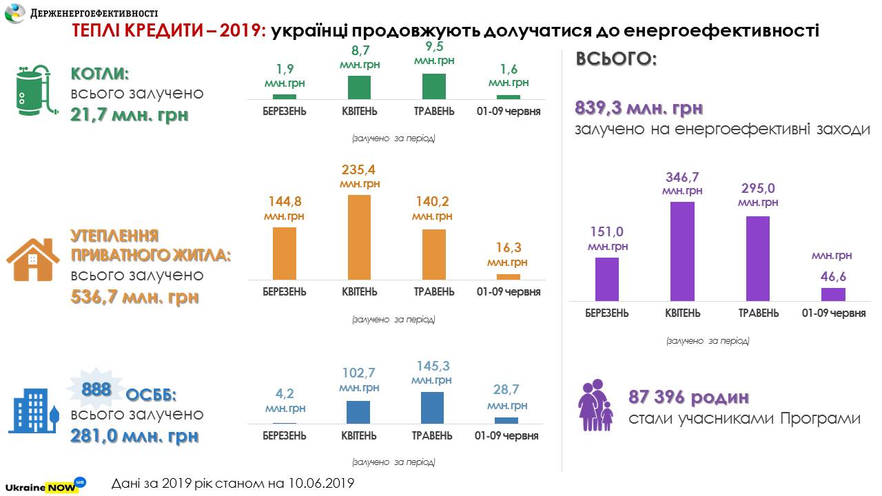Фактично за три місяці, із березня до початку червня ц.р., українські родини вже встигли залучити майже 840 млн грн «теплих кредитів» із прогнозованих 1,1 млрд грн у 2019 році.