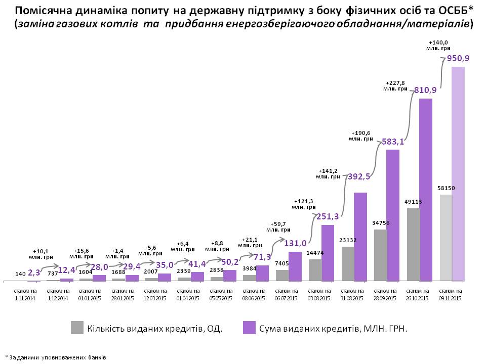 Станом на 9 листопада 2015 року банками видано кредитів на суму 950,9 млн.грн. “Більше 60 тисяч родин скористалися “теплими” кредитами та утеплили власні помешкання. Проте, нам ще є над чим працювати”, - наголосив Голова Агентства.