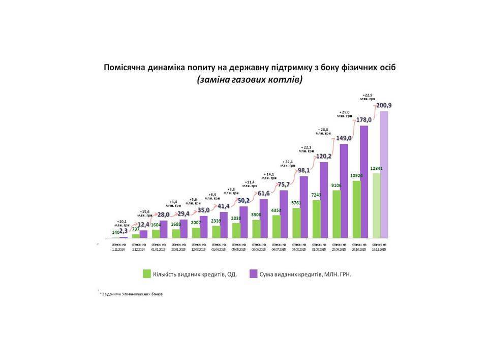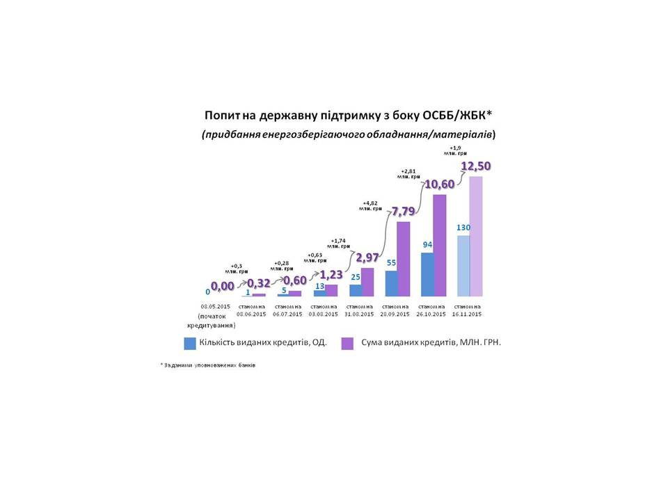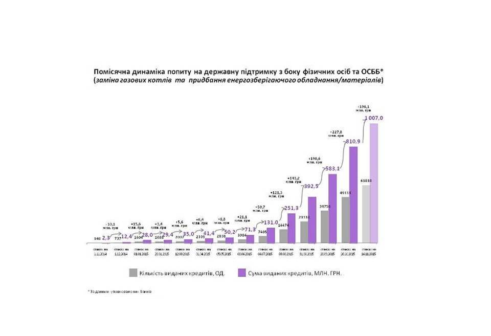 Станом на 16 листопада 2015 року, банками видано майже 62 тисячі "теплих" кредитів, загальною сумою 1,007 млрд.грн.