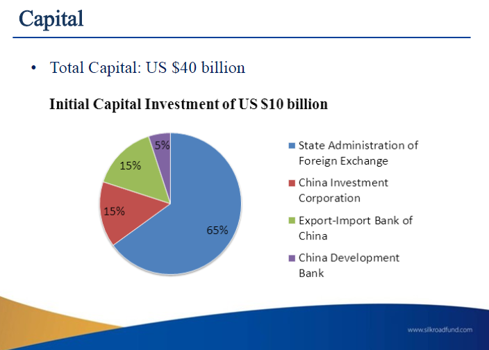 Китайський інвестиційний фонд «The Silk Road Fund» з початковим капіталом у 10 млрд доларів фінансує великі енергетичні, інфраструктурні проекти в країнах вздовж Нового шовкового шляху і Морського Шовкового шляху. Фонд створено у 2014 році за участю кількох установ: State Administrion of Foreign Exchange (http://www.safe.gov.cn), China Investment Corporation (www.china-inv.cn), China Development Bank (www.cdb.com.cn), China Export and Import Bank (http://english.eximbank.gov.cn). Загальний капітал фонду - 40 млрд доларів.