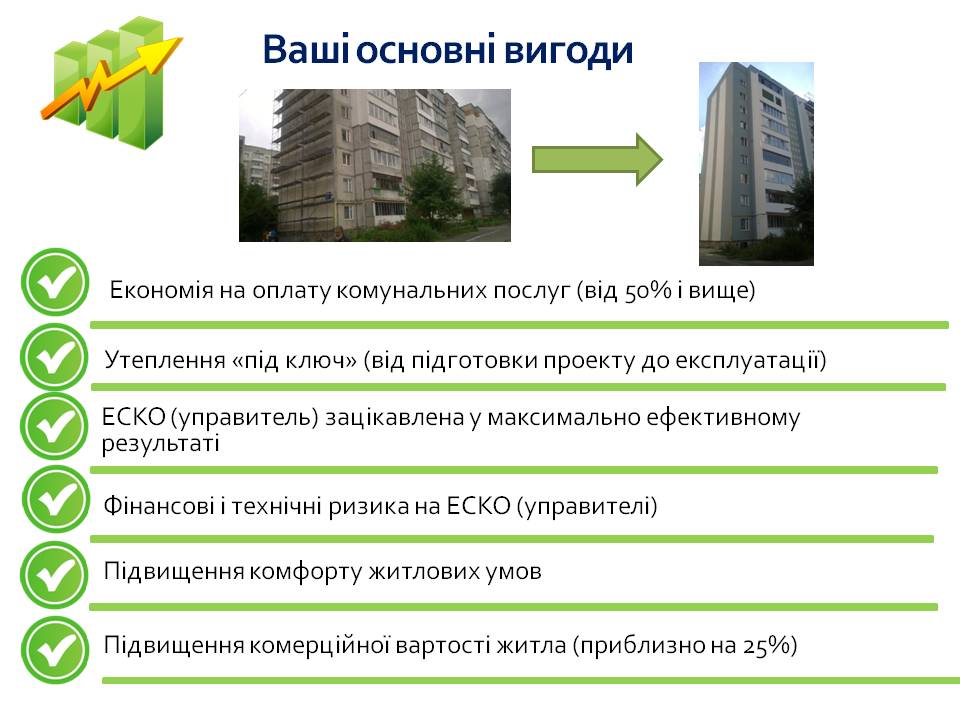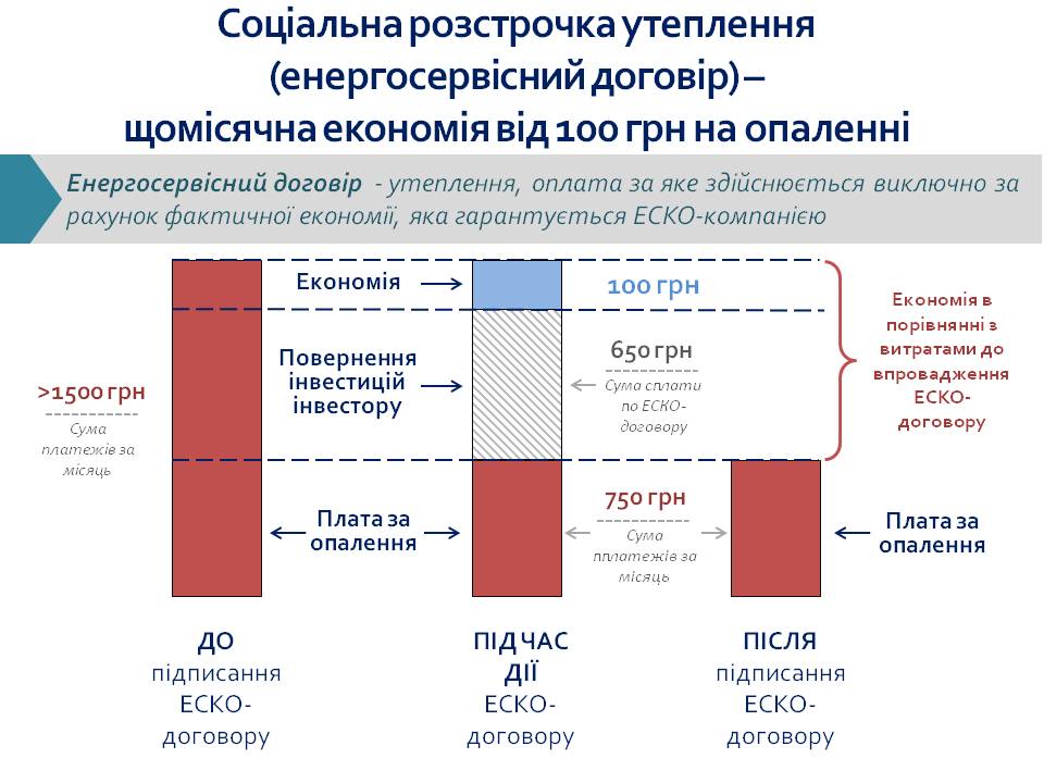 «Все більше регіонів України починають цікавитися ЕСКО-механізмом для підвищення енергоефективності будівель та створення комфортних умов перебування в них. Енергосервісний договір – утеплення, оплата за яке здійснюється виключно за рахунок фактичної економії, що гарантується ЕСКО-компанією. Адже саме ЕСКО-компанія бере на себе всі ризики, а будинок здійснює платежі на користь ЕСКО-компанії лише за умови досягнення економії», - підкреслив О. Корчміт та детально розповів про виконання ЕСКО-договорів.