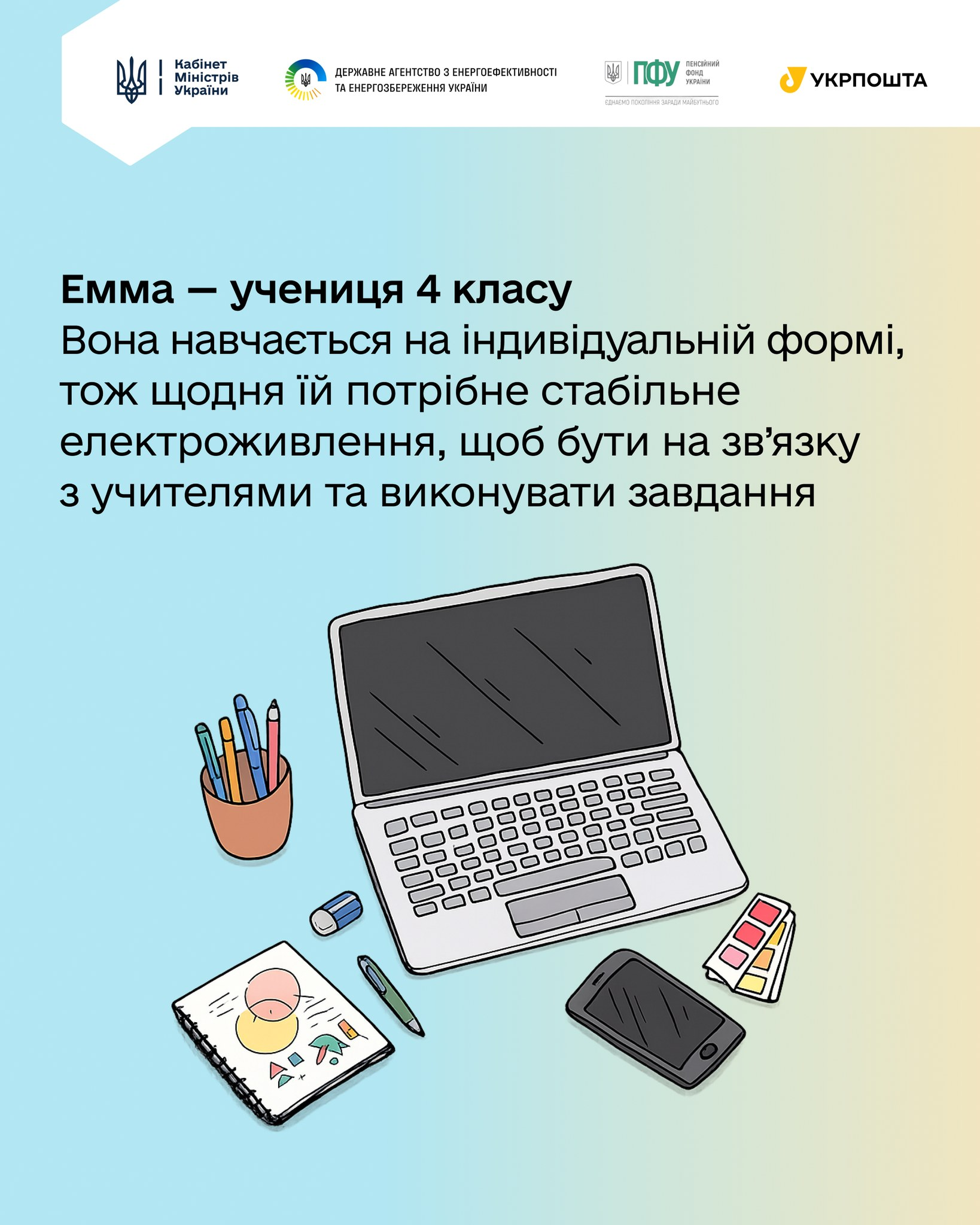 На фото — Емма. Учениця 4 класу, яка навчається на індивідуальній формі. Для неї стабільне електроживлення — це щоденна можливість бути на зв’язку з учителями, вчасно отримувати завдання і не випадати з навчального процесу.