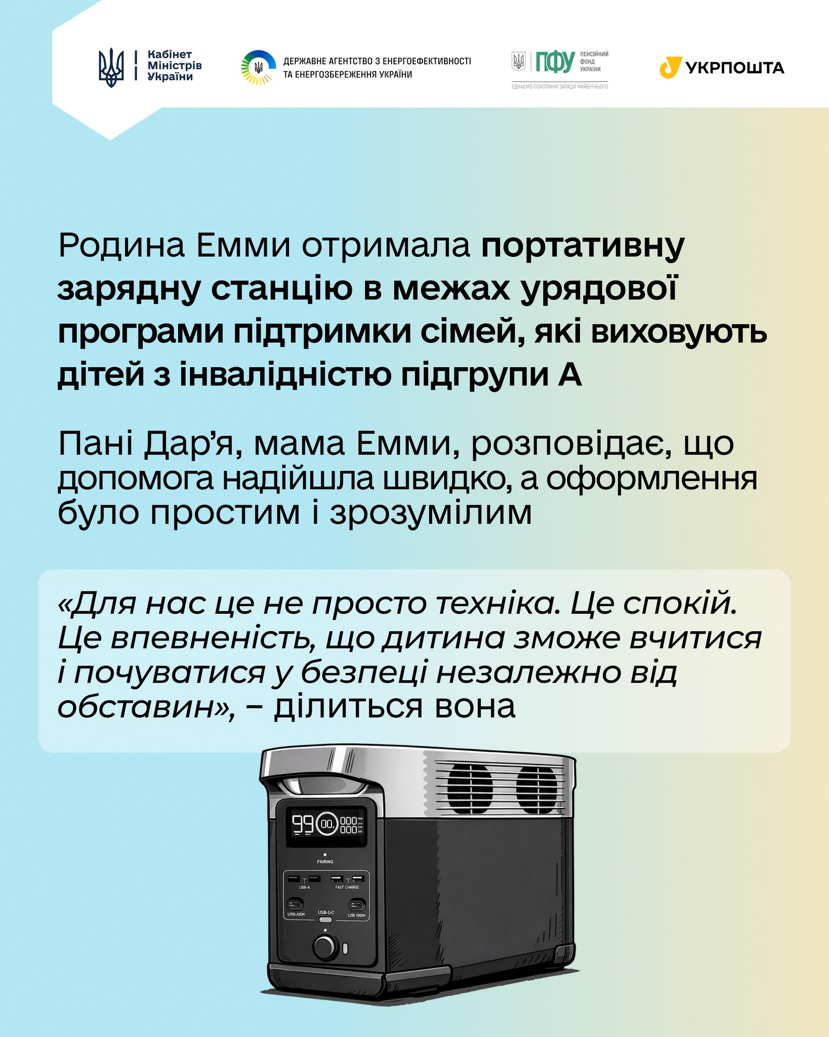 Родина Емми — серед тих, хто вже отримав від держави портативну зарядну станцію. Мама дівчинки розповідає: допомога надійшла швидко, оформлення було простим і зрозумілим. Також вона поділилась, що знайомі родини, які виховують дітей з інвалідністю підгрупи А, щиро вдячні за таку підтримку. Адже для багатьох безперебійне електроживлення — це питання здоров’я і навіть життя. Особливо коли діти підключені до медичних апаратів або потребують спеціального обладнання щодня.