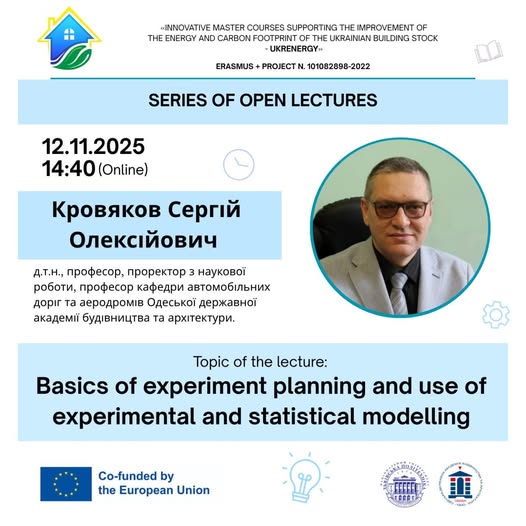 У рамках реалізації проєкту UKRENERGY Одеська державна академія будівництва та архітектури запрошує на онлайн лекцію Кровякова Сергія Олексійовича, доктора технічних наук, професора, проректора з наукової роботи, професора кафедри автомобільних доріг та аеродромів.