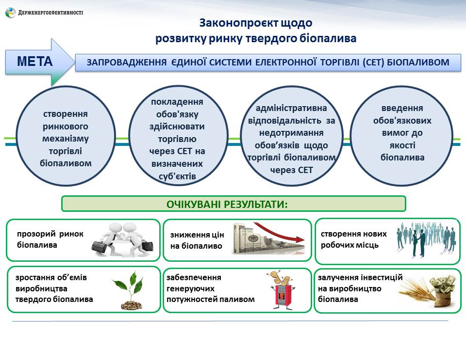 Для цього законопроєктом пропонується створити правовий фундамент для запровадження в Україні єдиної системи електронної торгівлі твердим біопаливом (далі – СЕТ).
