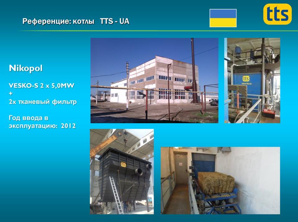 Компанія «TTS group» є лідером у використанні біомаси в енергетичних цілях в Чехії та має багаторічний досвід з виробництва промислових котлів на біомасі. Зокрема, котли виробництва цієї компанії спалюють солому в українському місті Нікополь. Крім цього, «TTS group» керує системою опалення в одинадцяти містах Чеською Республіки і Словаччини. Загалом компанія постачає більше 215 тис. Гкал тепла в рік.