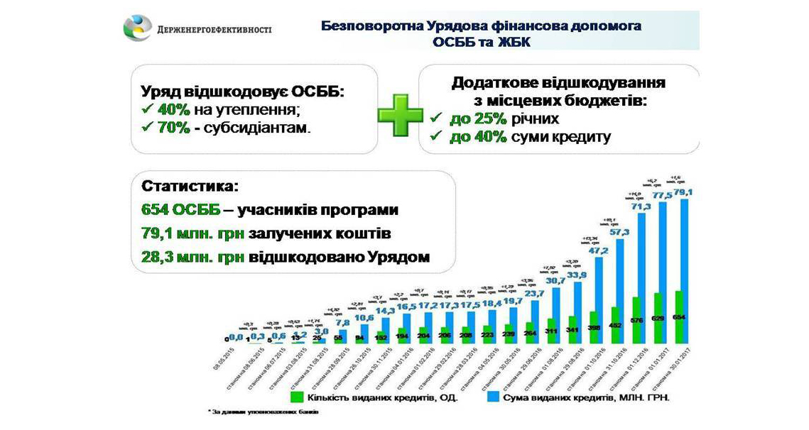 Все більше нових ОСББ приєднується до Урядової програми з енергоефективності. Так, у січні 2017 року 25 ОСББ стали її учасниками та залучили на впровадження енергоефективних заходів у своїх будинках 1,6 млн. гривень. Це у 2,2 рази більше ніж за аналогічний період минулого року, коли лише 10 ОСББ використали на ці цілі близько 700 тис гривень.
