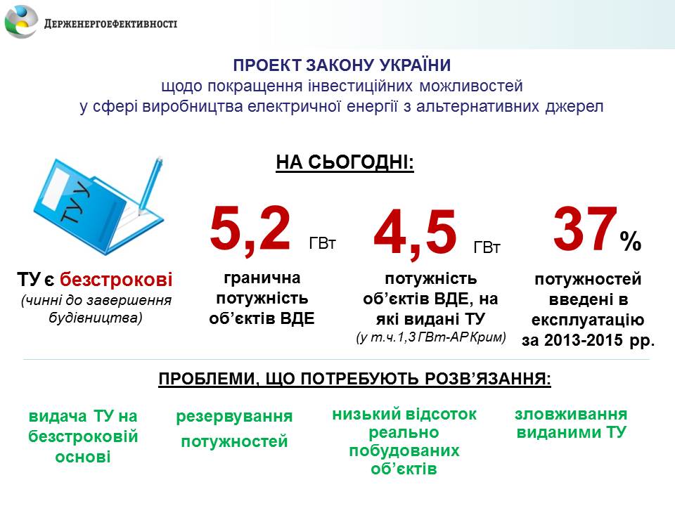 Голова Агентства пояснив, що на сьогодні з можливих для використання 5,2 ГВт потужностей об’єктів відновлюваної енергетики вже 4,5 ГВт «зарезервовані» відповідно до виданих технічних умов на приєднання до мереж. Дія технічних умов за чинним законодавством безстрокова, а з цих 4,5 ГВт «зарезервованих» потужностей лише 37% було введено в експлуатацію. Решту проектів досі не завершено, а в деяких випадках навіть не розпочато. Отже, у зацікавлених інвесторів немає можливостей для реалізації нових проектів з будівництва об'єктів "зеленої" енергетики.