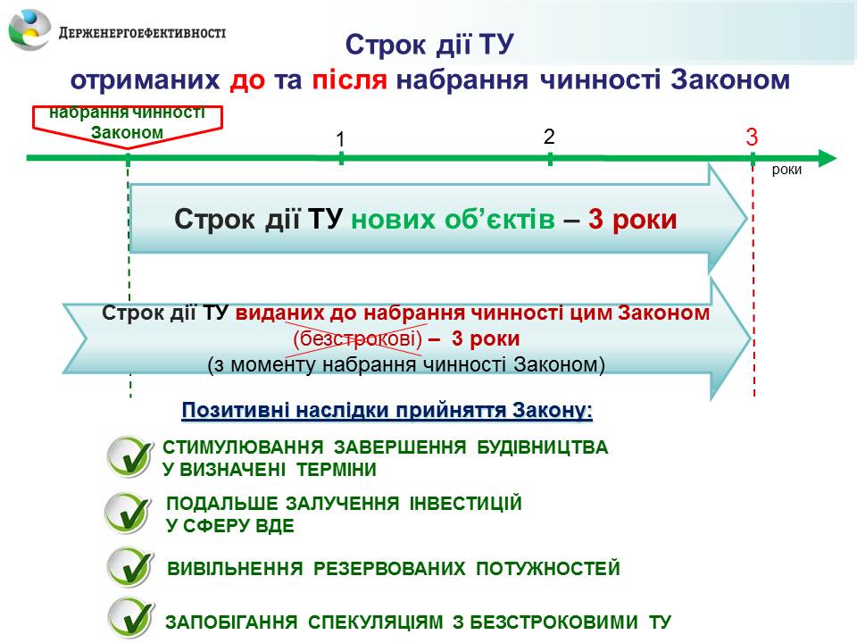 «У зв’язку з цим, ми пропонуємо конкретний 3-річний термін дії технічних умов для усіх: тих, хто планує отримати їх після прийняття законопроекту, а також тих, хто вже їх має. Це дозволить уникнути будь-яких спекуляцій та зловживань з вже виданими технічними умовами, стимулюватиме інвесторів вчасно завершувати будівництво об’єктів та полегшить доступ до мереж нових власників «зелених» проектів», - повідомив Голова Агентства.