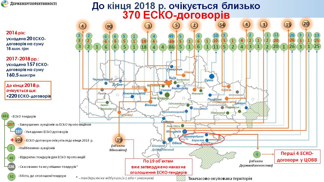 Загалом, сьогодні м. Київ та Київська область – лідери серед регіонів за кількістю укладених ЕСКО-контрактів, а саме – підписано 64 договори.