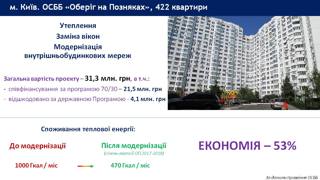 Київське ОСББ «Оберіг на Позняках», яке залучило рекордний за всю історію програми «теплий кредит» на суму майже 10 млн грн., доводить результативність механізму співфінансування енергоефективних заходів та безпосередню вигоду для мешканців 422 квартир багатоповерхівки.