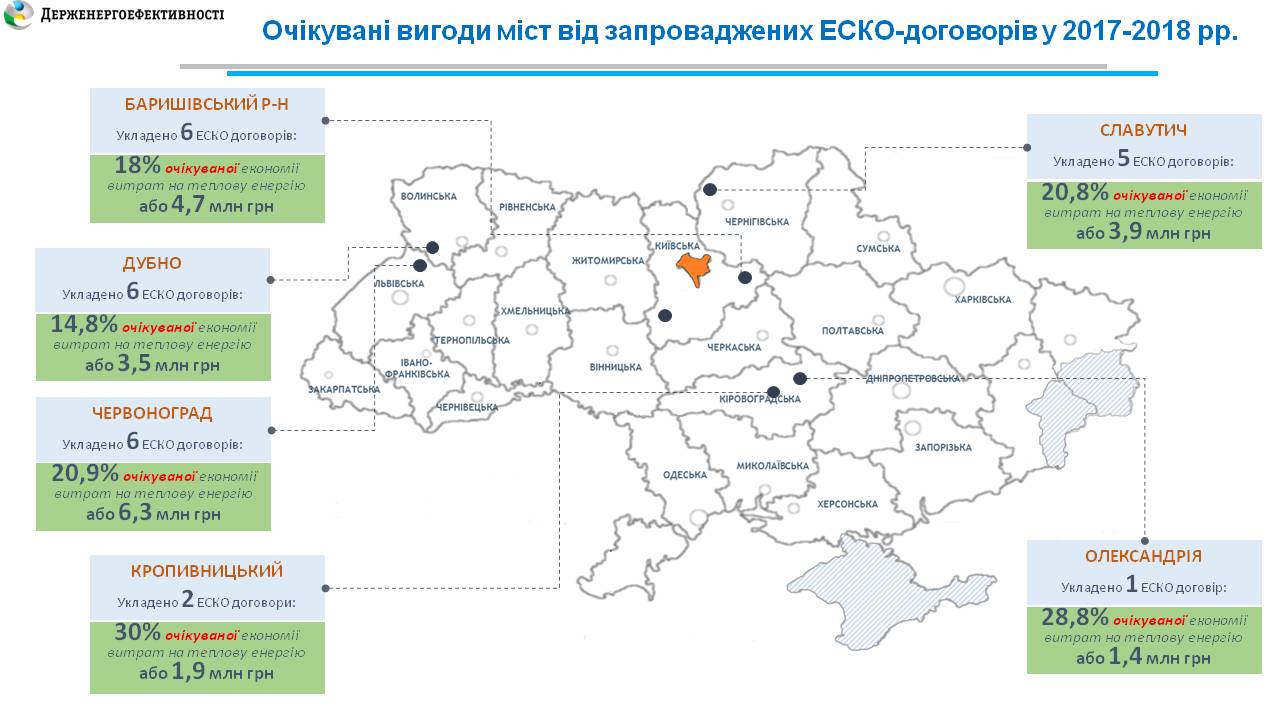 Сторони нещодавно підписаних ЕСКО-договорів також очікують на значний результат. Наприклад, за 6-ма проектами з енергосервісу у навчальних закладах Баришівського району (Київщина) передбачається економія витрат на теплову енергію до 5 млн грн за рік.